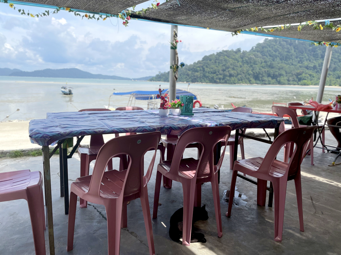 屋外テーブルでは沖合のパンコールラウ島を眺めながら食事が出来る。