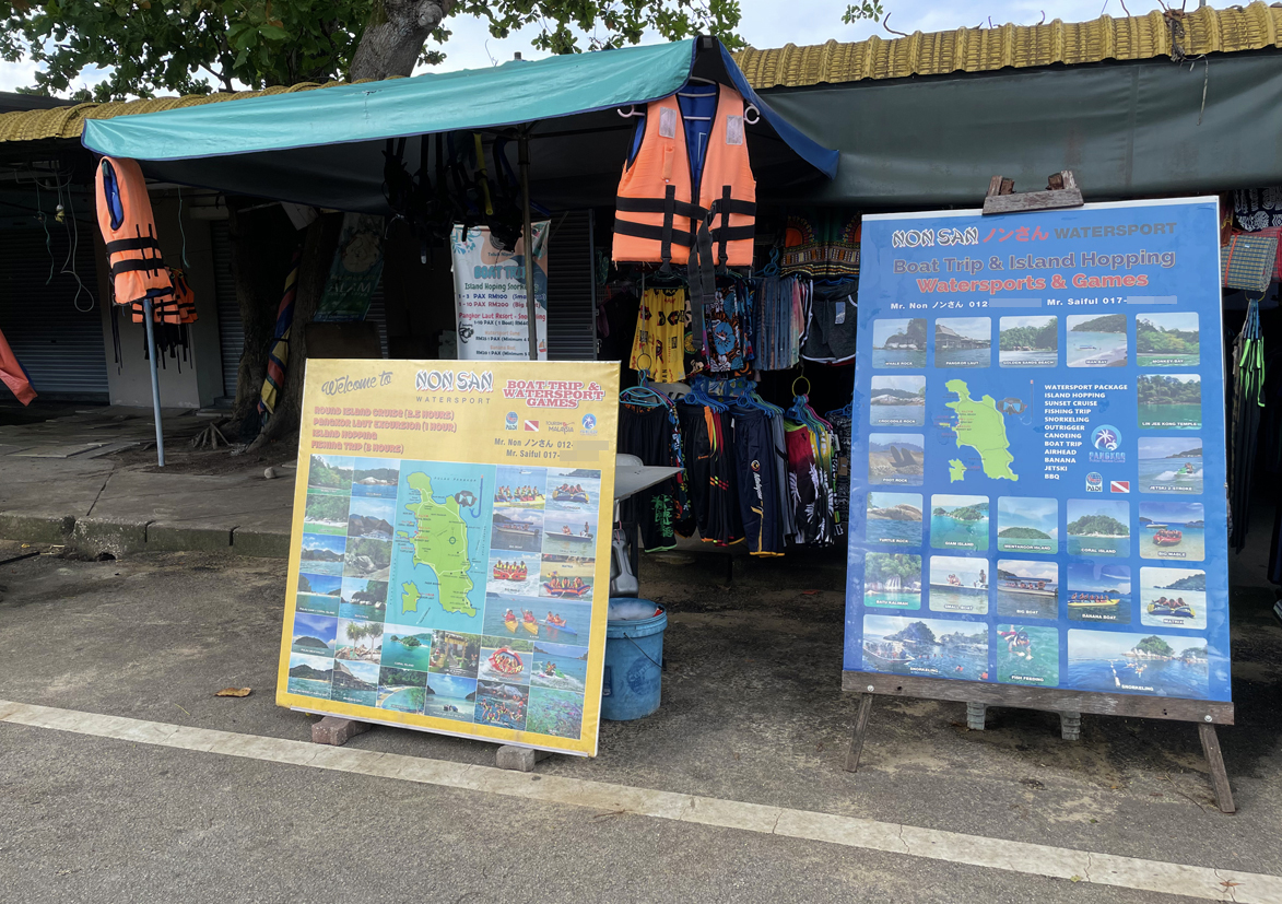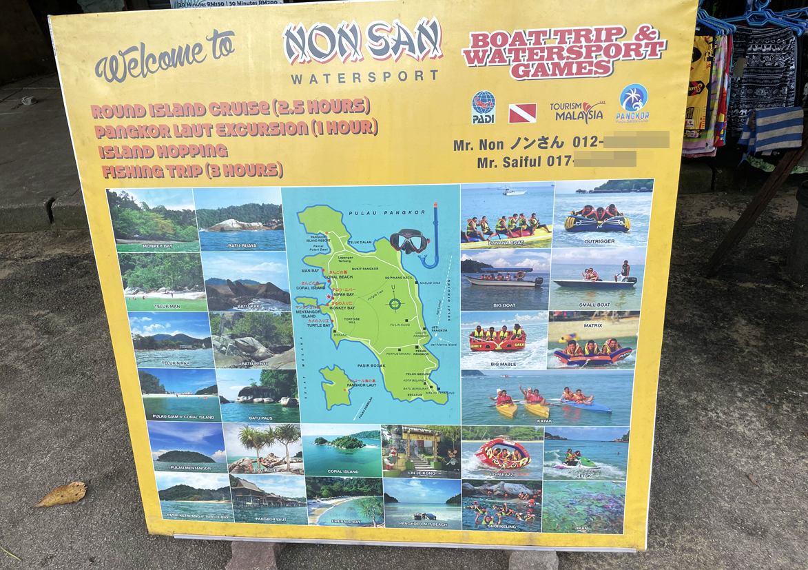 パンコール島では、ペナン島やランカウイ島などのそれとは違って、諸事情で多くの店がマリン・アクティビティの価格メニュー表を掲げていません。