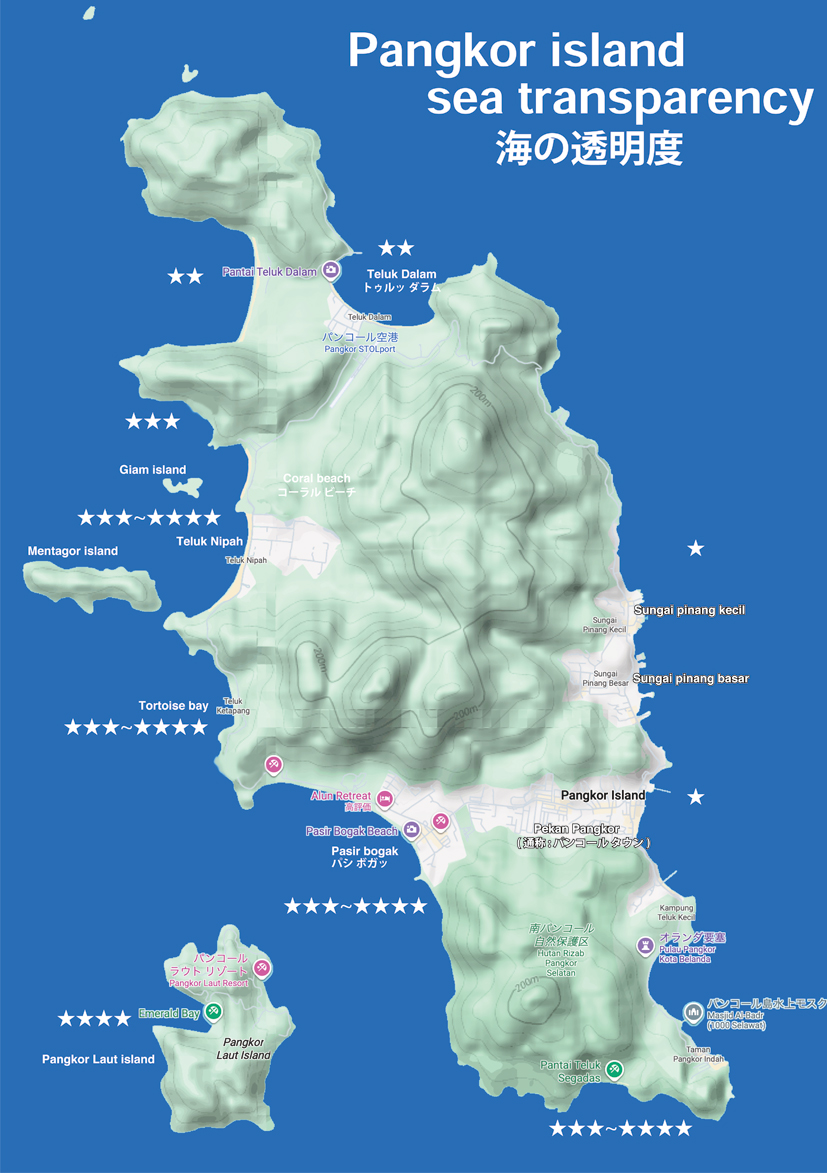 パンコール島の海の透明度はマレー半島東側のリゾート・アイランド(ルダン島・プルフンティアン島・ティオマン島など)には劣りますが、マレー半島西側の有人島(ランカウイ島やペナン島)の中では、透明度は良い方です。