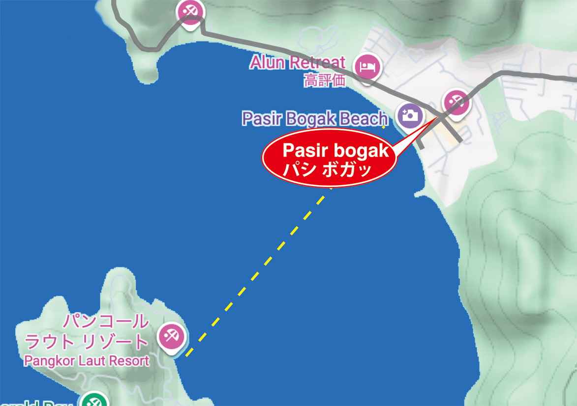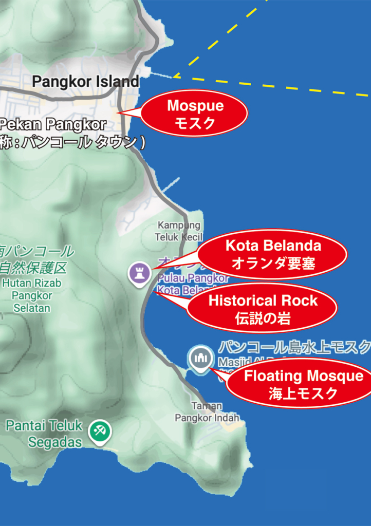 パンコールタウンからTeluk Gedung方面へ車で約7〜8分。