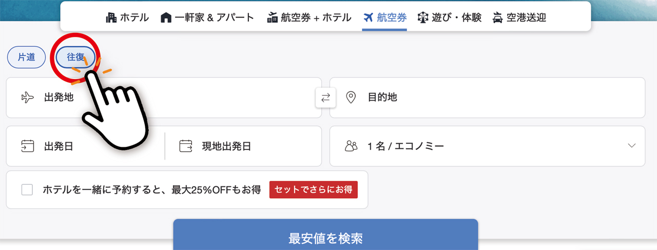 日付:往復の場合はRetuan dateも入力