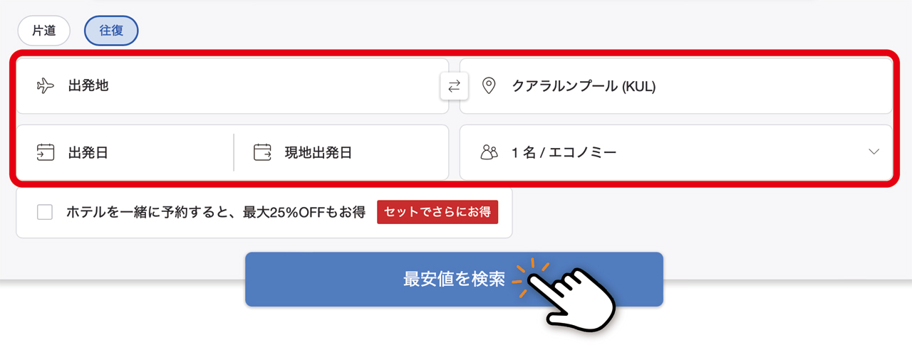 - 各項目に入力後、「最安値を検索」をクリック