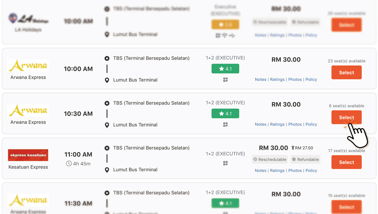 重ね重ねの説明で恐縮ですが、ご旅行中の移動日が週末やマレーシアの祝祭日(特に旧正月やラマダン明け)などの繁盛期に重なる場合以外は、予約の必要はありません。