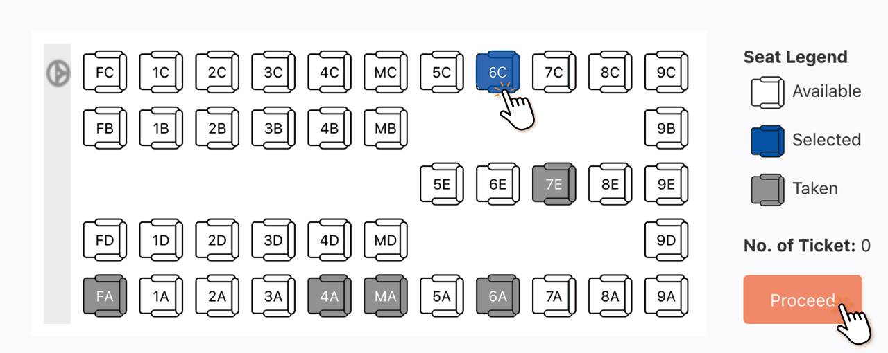ご希望の出発時刻のバスを選択後、白色の空席から希望する座席を選択し、『Proceed』をクリックして下さい。