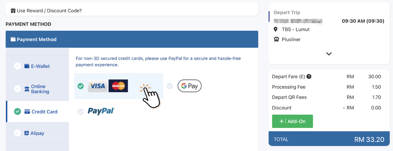 E-Wallet、Online Banking、Credit Card、Alipayのどれかを選択すると、使用出来る種類が表示されます。